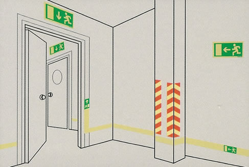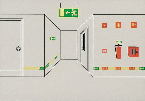 Esta norma prevê a colocação de sinais onde estes mais fazem falta, numa situação de incêndio - no pavimento e no rodapé das paredes, junto ao chão.